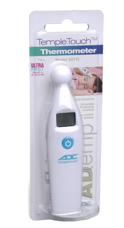 - Non-invasive forehead temperature measurement using patented conductive technology delivers clinically accurate readings in about 6 seconds
